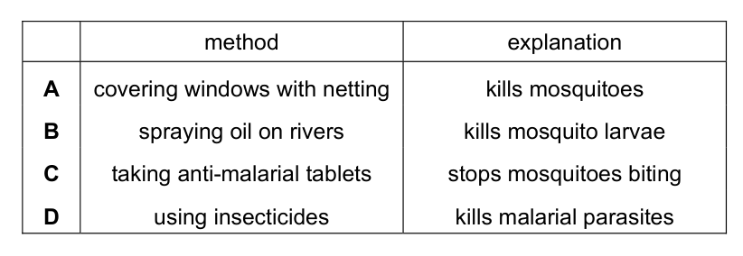 Which row matches a method of controlling malaria with the explanation of how this method