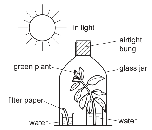 The diagram shows a green plant photosynthesising under a glass jar. This was used as a